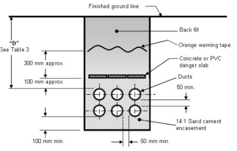 1. Base Layer: A layer of "14:1 Sand cement encasement" or sometimes just fine sand is laid at the bottom of the trench. The diagram specifies this base should be a minimum of 100 mm thick. This provides a smooth, stable, and protective bed for the ducts.